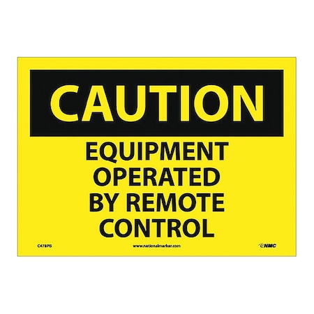 NMC C478PB OSHA Sign, Legend "CAUTION - EQUIPMENT OPERATED BY REMOTE CONTROL", 14" Length x 10" Height, Pressure Sensitive Adhesive Vinyl, Black on Yellow