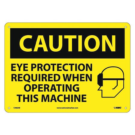 NMC C486AB OSHA Sign, Legend "CAUTION - EYE PROTECTION REQUIRED WHEN OPERATING THIS MACHINE" with Graphic, 14" Length x 10" Height, Aluminum, Black on Yellow