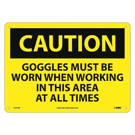 NMC C501RB OSHA Sign, Legend "CAUTION - GOGGLES MUST BE WORN WHEN WORKING IN THIS AREA AT ALL TIMES", 14" Length x 10" Height, Rigid Plastic, Black on Yellow