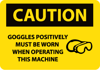 - High Visibility: the legend “CAUTION - GOGGLES POSITIVELY MUST BE WORN WHEN OPERATING THIS MACHINE” is printed in legible text to ensure better readability. The graphic of goggles makes the message easy to understand