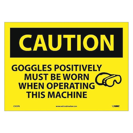 NMC C503PB OSHA Sign, Legend "CAUTION - GOGGLES POSITIVELY MUST BE WORN WHEN OPERATING THIS MACHINE" with Graphic, 14" Length x 10" Height, Pressure Sensitive Adhesive Vinyl, Black on Yellow