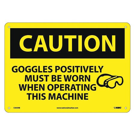 NMC C503RB OSHA Sign, Legend "CAUTION - GOGGLES POSITIVELY MUST BE WORN WHEN OPERATING THIS MACHINE" with Graphic, 14" Length x 10" Height, Rigid Plastic, Black on Yellow