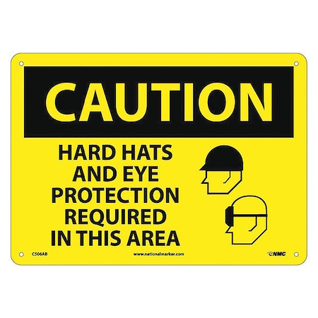 NMC C506AB OSHA Sign, Legend "CAUTION - HARD HATS AND EYE PROTECTION REQUIRED IN THIS AREA" with Graphic, 14" Length x 10" Height, Aluminum, Black on Yellow