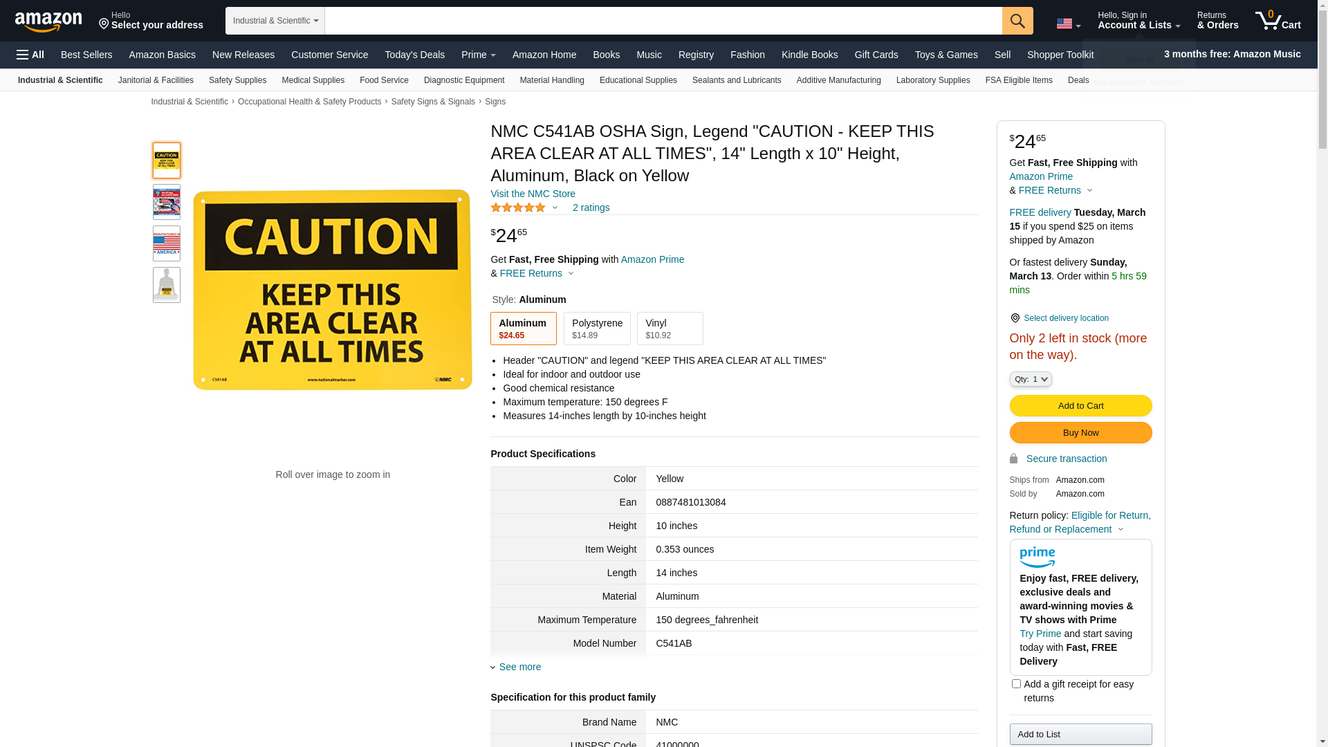 NMC C541AB OSHA Sign, Legend "CAUTION - KEEP THIS AREA CLEAR AT ALL TIMES", 14" Length x 10" Height, Aluminum, Black on Yellow