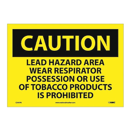 NMC C545PB OSHA Sign, Legend "CAUTION - LEAD HAZARD AREA WEAR RESPIRATOR POSSESSION OR USE OF TOBACCO PRODUCTS IS PROHIBITED", 14" Length x 10" Height, Pressure Sensitive Vinyl, Black on Yellow