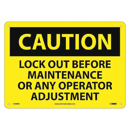 NMC C548AB OSHA Sign, Legend "CAUTION - LOCK OUT BEFORE MAINTENANCE OR ANY OPERATOR ADJUSTMENT", 14" Length x 10" Height, Aluminum, Black on Yellow