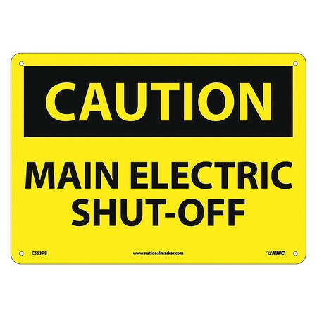 NMC C553RB OSHA Sign, Legend "CAUTION - MAIN ELECTRIC SHUT-OFF", 14" Length x 10" Height, Rigid Plastic, Black on Yellow
