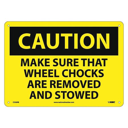 NMC C556RB OSHA Sign, Legend "CAUTION - MAKE SURE THAT WHEEL CHOCKS ARE REMOVED AND STOWED", 14" Length x 10" Height, Rigid Plastic, Black on Yellow