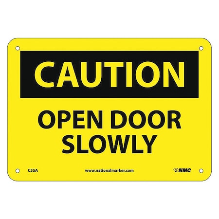 NMC C55A OSHA Sign, Legend "CAUTION - OPEN DOOR SLOWLY", 10" Length x 7" Height, Aluminum, Black on Yellow