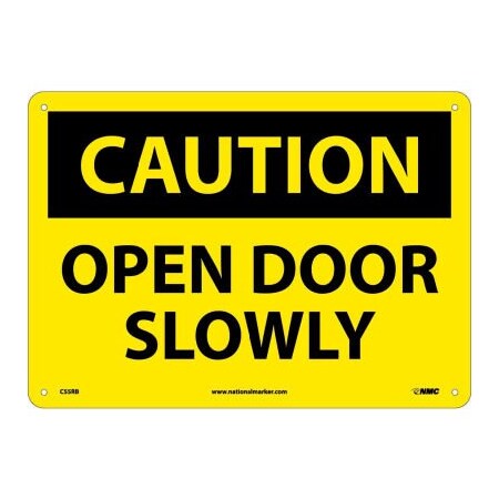 NMC C55RB OSHA Sign, Legend "CAUTION - OPEN DOOR SLOWLY", 14" Length x 10" Height, Rigid Plastic, Black on Yellow
