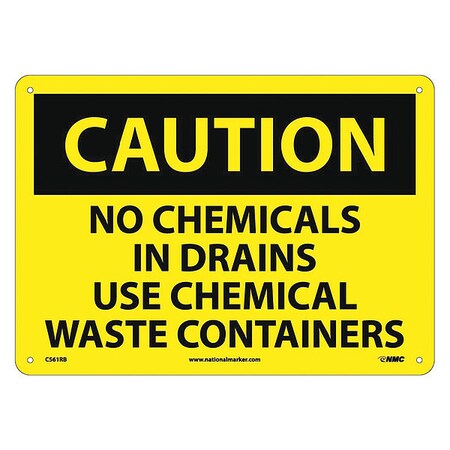 NMC C561RB OSHA Sign, Legend "CAUTION - NO CHEMICALS IN DRAINS USE CHEMICAL WASTE CONTAINERS", 14" Length x 10" Height, Rigid Plastic, Black on Yellow