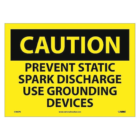 NMC C586PB OSHA Sign, Legend "CAUTION - PREVENT STATIC SPARK DISCHARGE USE GROUNDING DEVICES", 14" Length x 10" Height, Pressure Sensitive Vinyl, Black on Yellow