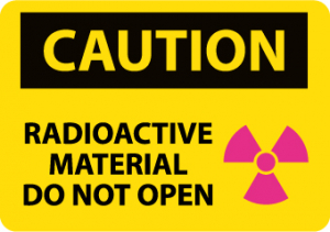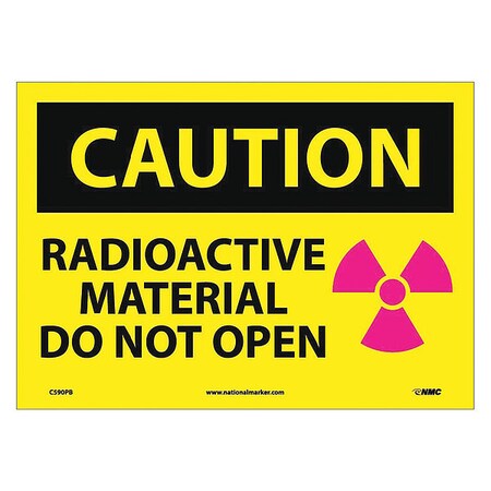 NMC C590PB OSHA Sign, Legend "CAUTION - RADIOACTIVE MATERIAL DO NOT OPEN" with Graphic, 14" Length x 10" Height, Pressure Sensitive Vinyl, Black/Pink on Yellow