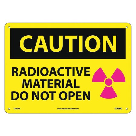 NMC C590RB OSHA Sign, Legend "CAUTION - RADIOACTIVE MATERIAL DO NOT OPEN" with Graphic, 14" Length x 10" Height, Rigid Plastic, Black/Pink on Yellow