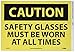 Caution Safety Glasses Must Be Worn At All Times Sign