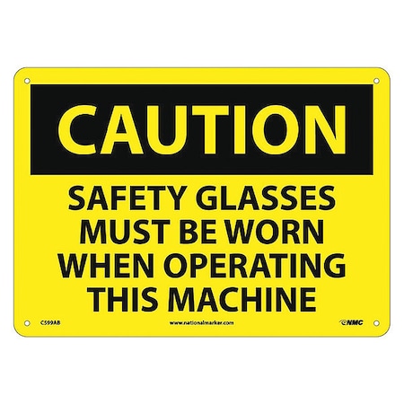 NMC C599AB OSHA Sign, Legend "CAUTION - SAFETY GLASSES MUST BE WORN WHEN OPERATING THIS MACHINE", 14" Length x 10" Height, Aluminum, Black on Yellow