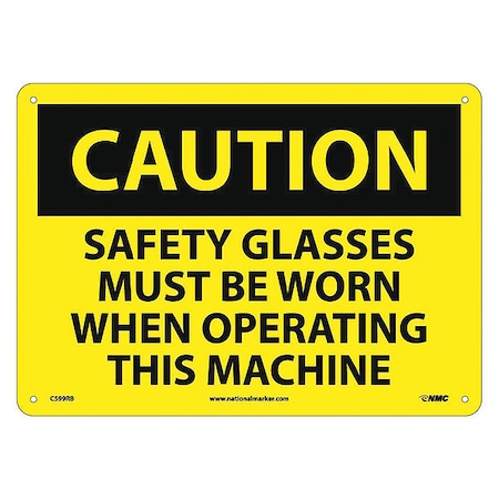 NMC C599RB OSHA Sign, Legend "CAUTION - SAFETY GLASSES MUST BE WORN WHEN OPERATING THIS MACHINE", 14" Length x 10" Height, Rigid Plastic, Black on Yellow