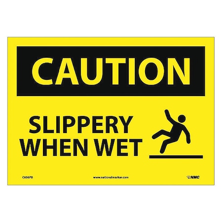NMC C606PB OSHA Sign, Legend "CAUTION - SLIPPERY WHEN WET" with Graphic, 14" Length x 10" Height, Pressure Sensitive Vinyl, Black on Yellow