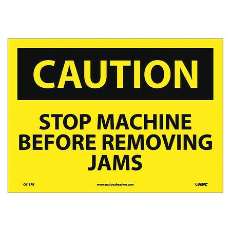 NMC C613PB OSHA Sign, Legend "CAUTION - STOP MACHINE BEFORE REMOVING JAMS", 14" Length x 10" Height, Pressure Sensitive Vinyl, Black on Yellow