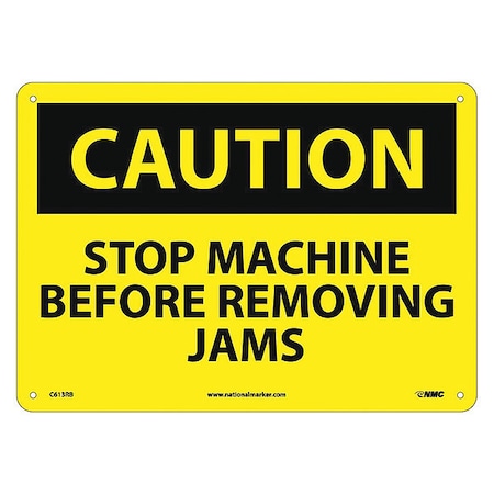 NMC C613RB OSHA Sign, Legend "CAUTION - STOP MACHINE BEFORE REMOVING JAMS", 14" Length x 10" Height, Rigid Plastic, Black on Yellow