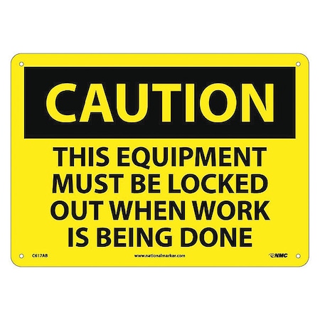 NMC C617AB OSHA Sign, Legend "CAUTION - THIS EQUIPMENT MUST BE LOCKED OUT WHEN WORK IS BEING DONE", 14" Length x 10" Height, Aluminum, Black on Yellow
