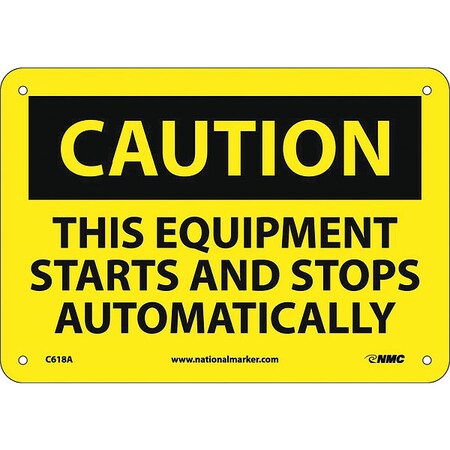 NMC C618A OSHA Sign, Legend "CAUTION - THIS EQUIPMENT STARTS AND STOPS AUTOMATICALLY", 10" Length x 7" Height, Aluminum, Black on Yellow