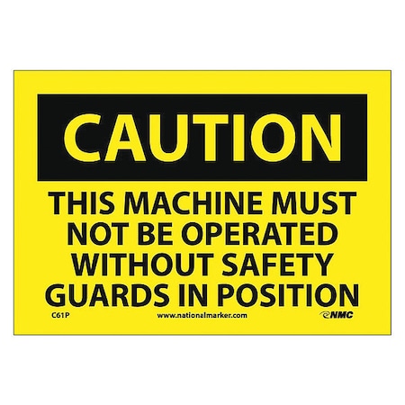 NMC C61P OSHA Sign, Legend "CAUTION - THIS MACHINE MUST NOT BE OPERATED WITHOUT SAFETY GUARDS IN POSITION", 10" Length x 7" Height, Pressure Sensitive Vinyl, Black on Yellow