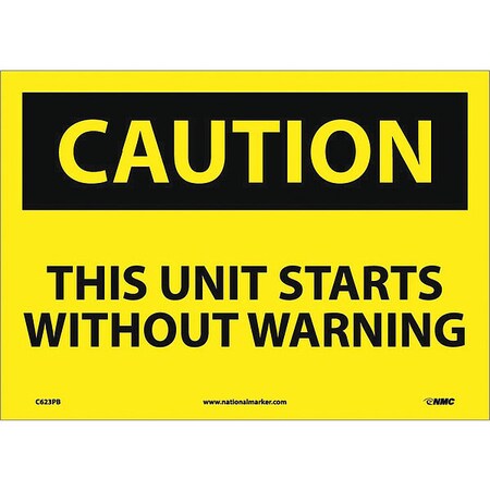 NMC C623PB OSHA Sign, Legend "CAUTION - THIS UNIT STARTS WITHOUT WARNING", 14" Length x 10" Height, Pressure Sensitive Vinyl, Black on Yellow