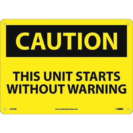 NMC C623RB OSHA Sign, Legend "CAUTION - THIS UNIT STARTS WITHOUT WARNING", 14" Length x 10" Height, Rigid Plastic, Black on Yellow