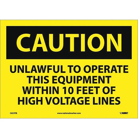 NMC C627PB OSHA Sign, Legend "CAUTION - UNLAWFUL TO OPERATE THIS EQUIPMENT WITHIN 10 FT OF HIGH VOLTAGE LINES", 14" Length x 10" Height, Pressure Sensitive Vinyl, Black on Yellow