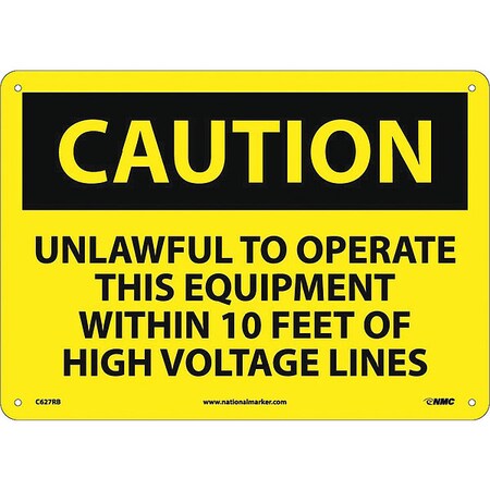 NMC C627RB OSHA Sign, Legend "CAUTION - UNLAWFUL TO OPERATE THIS EQUIPMENT WITHIN 10 FT OF HIGH VOLTAGE LINES", 14" Length x 10" Height, Rigid Plastic, Black on Yellow