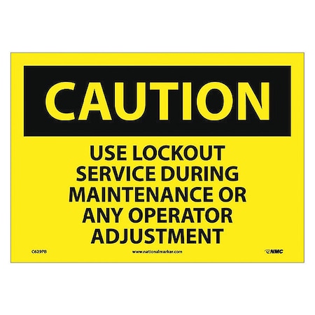 NMC C629PB OSHA Sign, Legend "CAUTION - USE LOCKOUT SERVICE DURING MAINTENANCE OR ANY OPERATOR ADJUSTMENT", 14" Length x 10" Height, Pressure Sensitive Vinyl, Black on Yellow