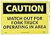 - Header "CAUTION" and legend "WATCH OUT FOR FORK TRUCK OPERATING IN AREA"
