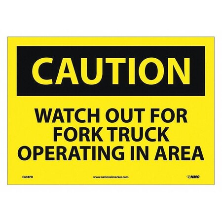 NMC C638PB OSHA Sign, Legend "CAUTION - WATCH OUT FOR FORK TRUCK OPERATING IN AREA", 14" Length x 10" Height, Pressure Sensitive Vinyl, Black on Yellow