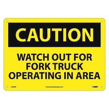 NMC C638RB OSHA Sign, Legend "CAUTION - WATCH OUT FOR FORK TRUCK OPERATING IN AREA", 14" Length x 10" Height, Rigid Plastic, Black on Yellow