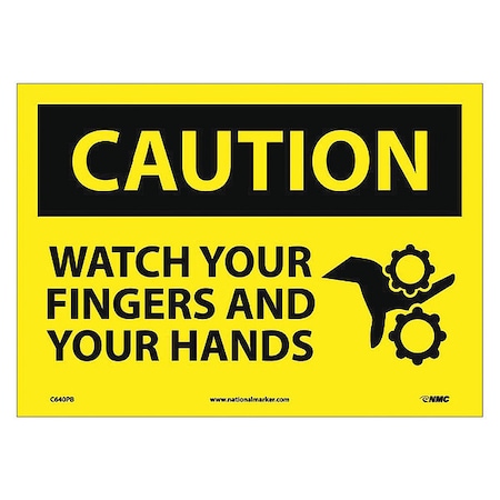NMC C640PB OSHA Sign, Legend "CAUTION - WATCH YOUR FINGERS AND YOUR HANDS" with Graphic, 14" Length x 10" Height, Pressure Sensitive Vinyl, Black on Yellow