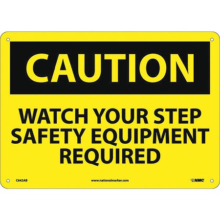 NMC C642AB OSHA Sign, Legend "CAUTION - WATCH YOUR STEP SAFETY EQUIPMENT REQUIRED", 14" Length x 10" Height, Aluminum, Black on Yellow