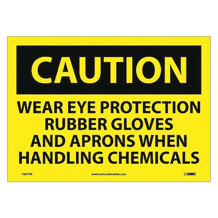 NMC C647PB OSHA Sign, Legend "CAUTION - WEAR EYE PROTECTION RUBBER GLOVES AND APRONS WHEN HANDLING CHEMICALS", 14" Length x 10" Height, Pressure Sensitive Vinyl, Black on Yellow