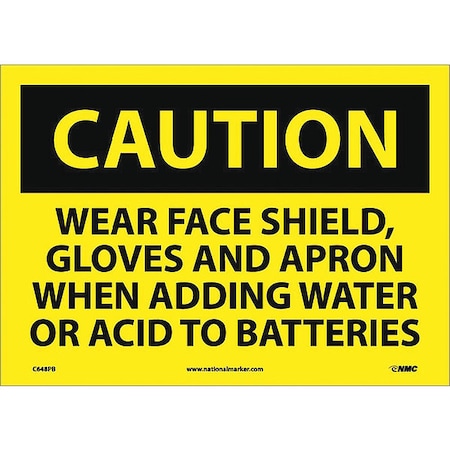 NMC C648PB OSHA Sign, Legend "CAUTION - WEAR FACE SHIELD, GLOVES AND APRON WHEN ADDING WATER OR ACID TO BATTERIES", 14" Length x 10" Height, Pressure Sensitive Vinyl, Black on Yellow