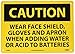 - Header "CAUTION" and legend "WEAR FACE SHIELD, GLOVES AND APRON WHEN ADDING WATER OR ACID TO BATTERIES"