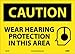 | Feature | Header "CAUTION" and legend "WEAR HEARING PROTECTION IN THIS AREA" with graphic |