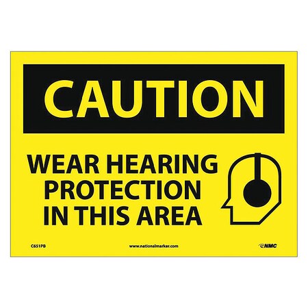 NMC C651PB OSHA Sign, Legend "CAUTION - WEAR HEARING PROTECTION IN THIS AREA" with Graphic, 14" Length x 10" Height, Pressure Sensitive Vinyl, Black on Yellow