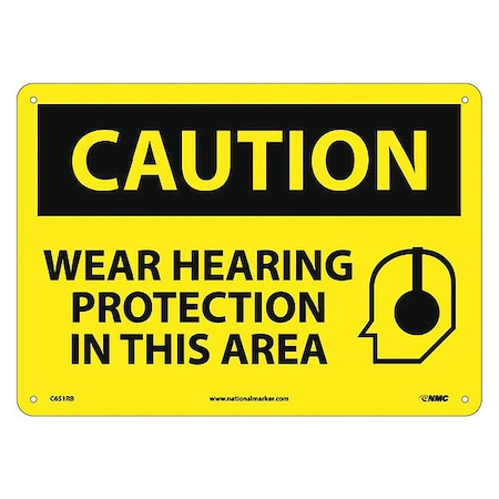NMC C651RB OSHA Sign, Legend "CAUTION - WEAR HEARING PROTECTION IN THIS AREA" with Graphic, 14" Length x 10" Height, Rigid Plastic, Black on Yellow