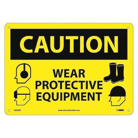 NMC C653AB OSHA Sign, Legend "CAUTION - WEAR PROTECTIVE EQUIPMENTS" with Graphic, 14" Length x 10" Height, Aluminum, Black on Yellow