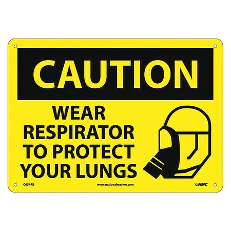 NMC C654RB OSHA Sign, Legend "CAUTION - WEAR RESPIRATOR TO PROTECT YOUR LUNGS" with Graphic, 14" Length x 10" Height, Rigid Plastic, Black on Yellow