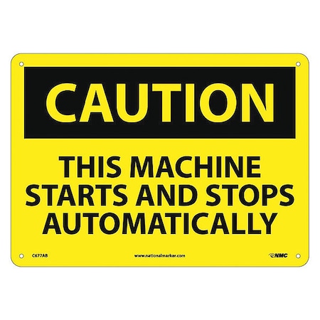 NMC C677AB OSHA Sign, Legend "CAUTION - THIS MACHINE STARTS AND STOPS AUTOMATICALLY", 14" Length x 10" Height, Aluminum, Black on Yellow