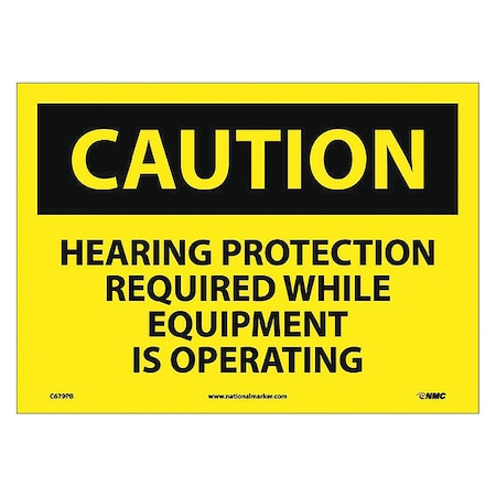 NMC C679PB OSHA Sign, Legend "CAUTION - HEARING PROTECTION REQUIRED WHILE EQUIPMENT IS OPERATING", 14" Length x 10" Height, Pressure Sensitive Vinyl, Black on Yellow