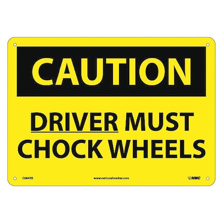 NMC C684RB OSHA Sign, Legend "CAUTION - DRIVER MUST CHOCK WHEELS", 14" Length x 10" Height, Rigid Plastic, Black on Yellow