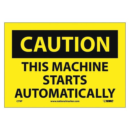 NMC C79P OSHA Sign, Legend "CAUTION - THIS MACHINE STARTS AUTOMATICALLY", 10" Length x 7" Height, Pressure Sensitive Vinyl, Black on Yellow