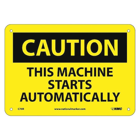 NMC C79R OSHA Sign, Legend "CAUTION - THIS MACHINE STARTS AUTOMATICALLY", 10" Length x 7" Height, Rigid Plastic, Black on Yellow